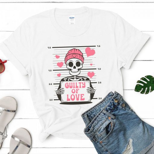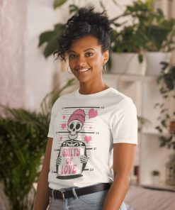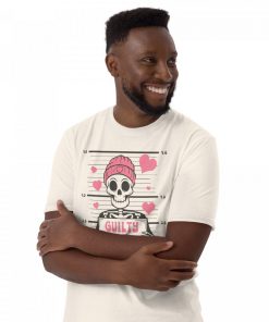 - Skeleton Graphic with “Guilty of Love” Phrase: The bold skeleton graphic combined with the humorous “Guilty of Love” phrase gives this shirt a playful edge, making it a perfect way to show off your sense of humor while celebrating love.