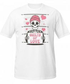 - Humorous and Unique Design: Featuring a skeleton graphic and the phrase “Guilty of Love,” this shirt makes a bold statement that’s perfect for those who enjoy a mix of humor and attitude.